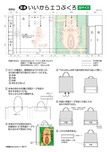 変身★絵本のカバーでエコぶくろ 2010.08.20絵本のカバーを利用した手作りエコぶくろです。 愛読者のみなさまが気軽にチャレンジできるように、展開図と作り方をご用意しました。 どうぞお役立てください。エコぶくろマニュアルをダウンロード「いいから いいから」エコぶくろマニュアル(旧サイズ)「いいから いいから」エコぶくろマニュアル(新サイズ)「妖怪横丁」エコぶくろマニュアル「パンダ銭湯」エコぶくろマニュアルエコぶくろマニュアル 2025.10.3更新 読売新聞に変身エコぶくろ読売新聞「顔」欄で、弊社の武井満津子と変身エコぶくろが紹介されました。